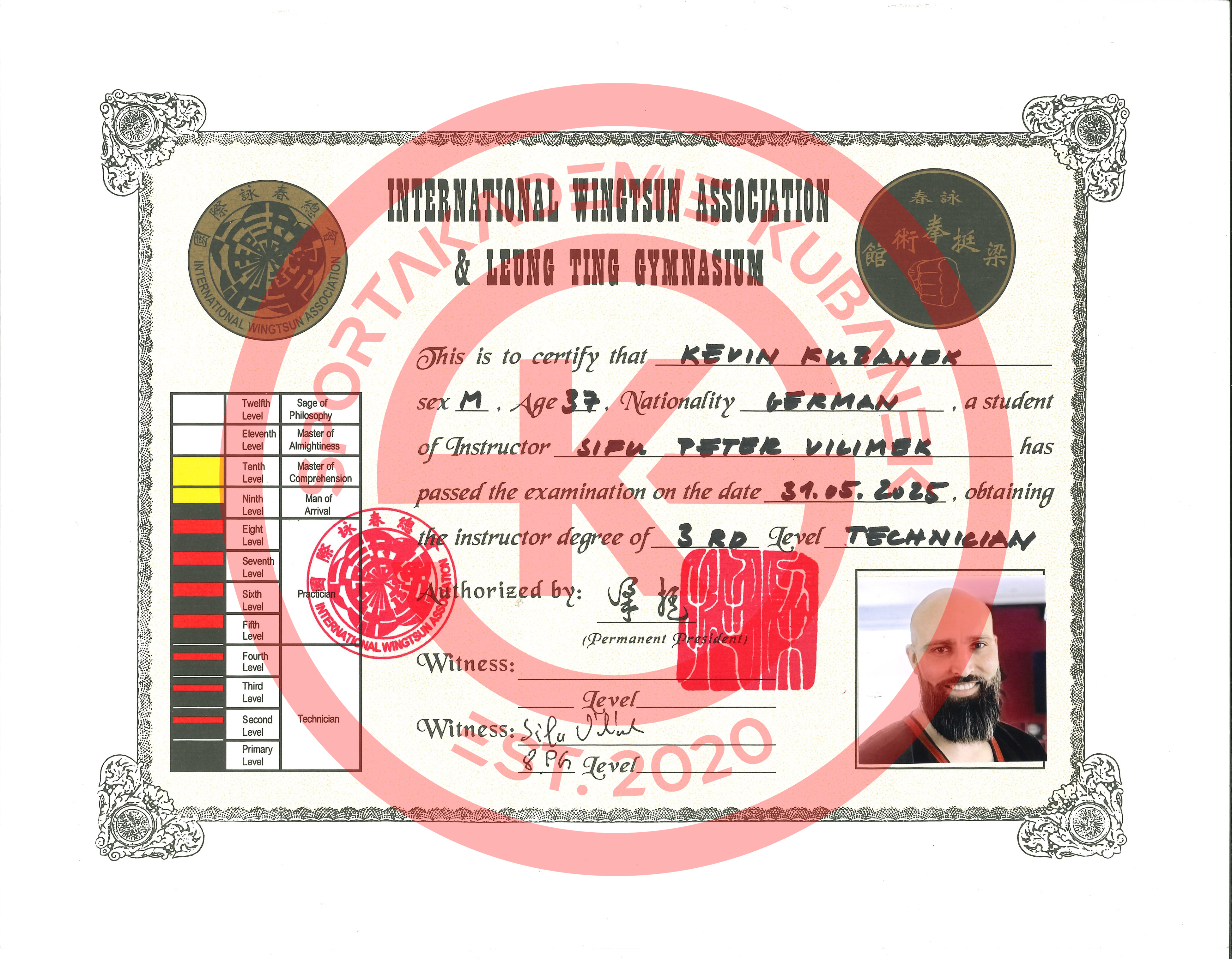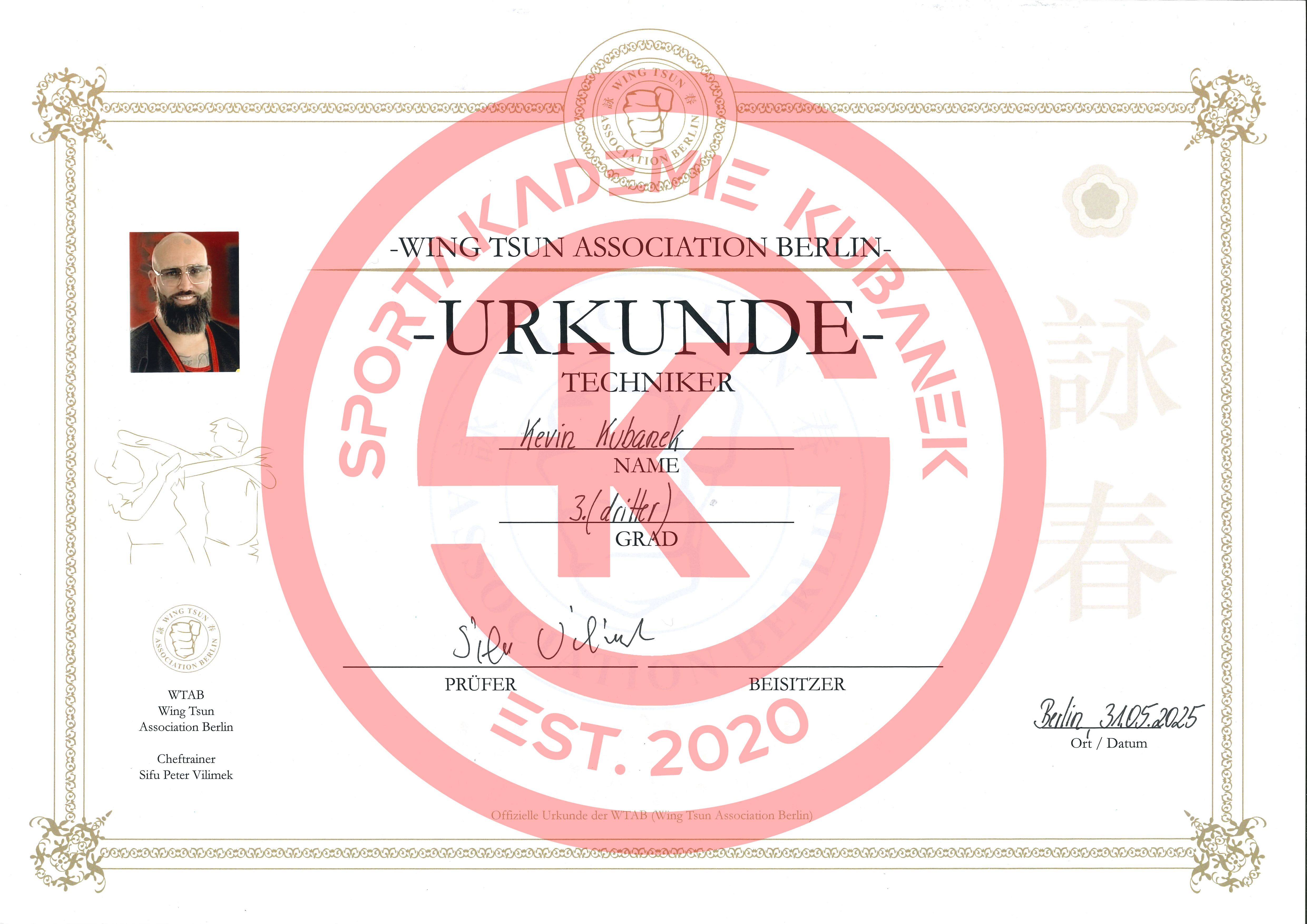 Ein entscheidender Meilenstein war der 31. Mai 2025. An diesem Tag erhielt Sifu Kevin den 3. Technikergrad im Leung Ting WingTsun Kung Fu - eine Auszeichnung, die nur wenige erreichen und die tiefes Verständnis, jahrelanges Training und außergewöhnliche Lernfähigkeit und Disziplin widerspiegelt,